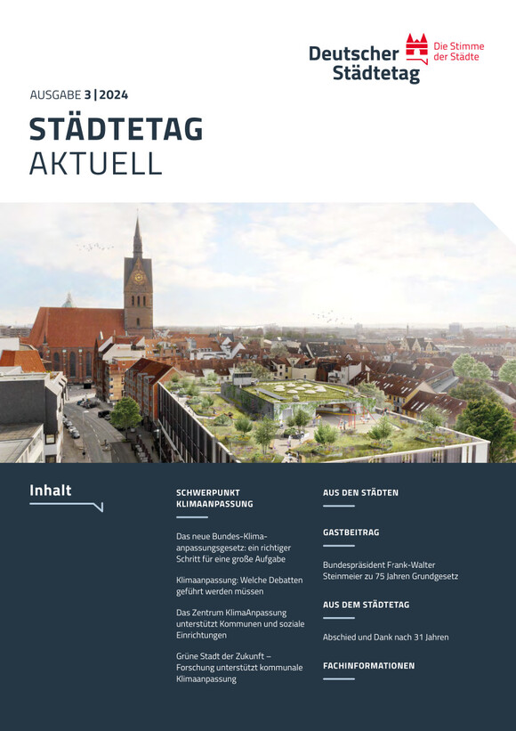 Heute stellen wir Ihnen außerdem eine neue Ausgabe von Städtetag aktuell vor — dieses Mal dreht sich das Heft um Klimaanpassung in den Städten. Die jüngsten Hochwasser sind ein weiteres Warnsignal: Wenn wir wollen, dass unsere Städte lebenswerte Orte bleiben, müssen wir etwas tun.