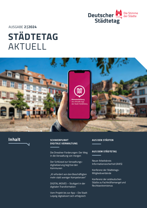 Zu den großen Zukunftsthemen der Kommunen gehört unter anderem die Digitalisierung der Verwaltung. Das ist auch der Schwerpunkt der neuen Ausgabe von Städtetag Aktuell. Mit dem neuesten Heft wollen wir zeigen, was bereits in den Städten erfolgreich umgesetzt wird, aber auch, welche Forderungen die Städte noch an Bund und Länder richten.