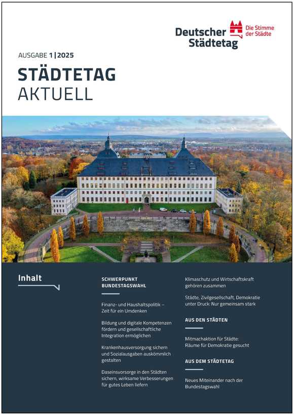 in etwas mehr als zwei Wochen ist die vorgezogene Bundestagswahl. Den Forderungen der Städte an die künftige Bundesregierung widmet sich die neue Ausgabe von "Städtetag aktuell". In sechs Beiträgen erläutern die Beigeordneten des Deutschen Städtetages, was für die Städte nach der Wahl besonders wichtig ist. Dabei geht es um Kommunalfinanzen, Bildung, Integration, Krankenhäuser, Sozialausgaben, Wohnraum, Klimaschutz, kommunale Selbstverwaltung und Verwaltungsdigitalisierung.