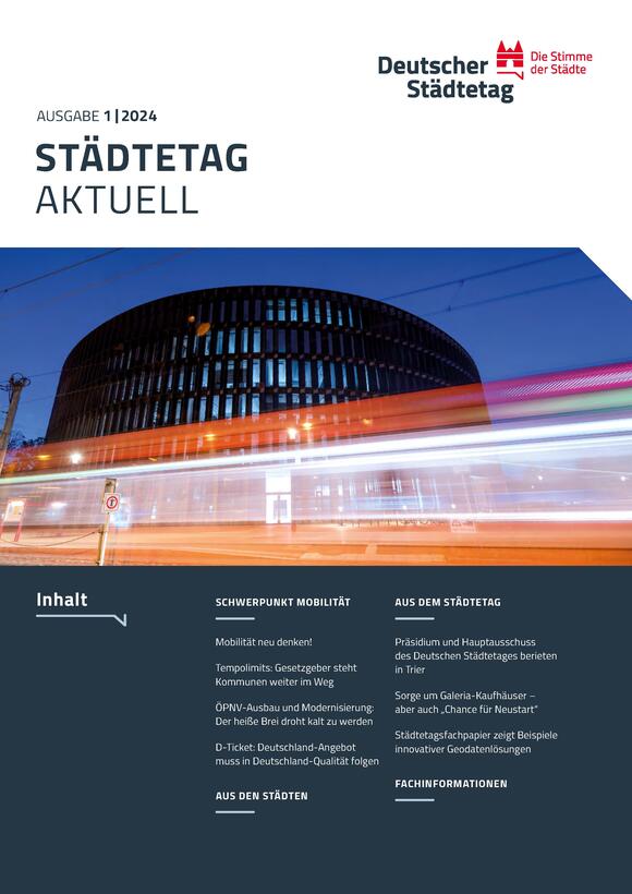 Wie sieht die Mobilität der Zukunft in den Städten aus? Das wird intensiv und aus unterschiedlichen Perspektiven diskutiert. In vielen Städten und Mobilitätsprojekten ist die Zukunft der Mobilität auch schon erlebbar. Etwa mit mehr Platz fürs Rad und für Fußgänger, mit dem Ausbau des Nahverkehrsangebots und neuen Bahnen und Bussen. Ein spannender Überblick ist mit Ausgabe 1|2024 von Städtetag aktuell erschienen. Verkehrsexpertinnen und Verkehrsexperten formulieren ihre Erwartungen und geben einen Ausblick auf den städtischen Verkehr von morgen. Erstmals widmet sich das Städtetags-Magazin damit einem Themen-Schwerpunkt. Schauen Sie rein!