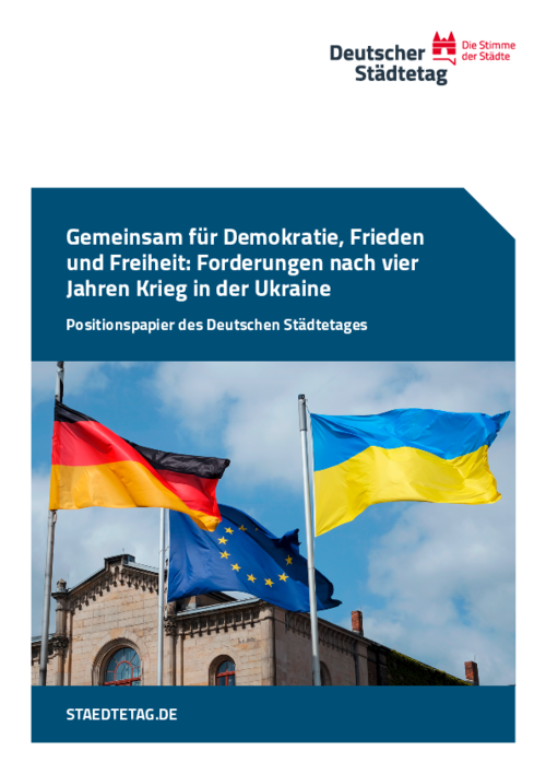Seit vier Jahren kämpft die Ukraine für ihre und unsere europäische Zukunft. Die wirtschaftlichen und gesellschaftlichen Auswirkungen des Ukraine-Krieges sind in ganz Europa deutlich spürbar. Anlässlich des vierten Jahrestages des vollumfänglichen völkerrechtswidrigen russischen Angriffs auf die Ukraine und des andauernden Krieges bekräftigen die deutschen Städte daher ihre Solidarität und ihre Unterstützung. Sie stehen weiterhin fest an der Seite der Ukraine.
