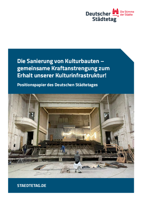 Wie können die Kommunen die erforderliche Sanierung von Kulturbauten angesichts der dramatischen kommunalen Finanzlage schultern? Welche Unterstützung benötigen die Städte und Gemeinde dafür von Bund und Ländern? Das sind die Ausgangsfragen dieses Positionspapieres des Deutschen Städtetages.