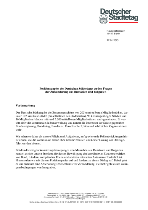 Das Präsidium des Deutschen Städtetages hat das Positionspapier auf seiner 392. Sitzung am 5. Februar 2013 zustimmend zur Kenntnis genommen und Bund und Länder aufgefordert, sich der Problematik anzunehmen und auch auf der Europäischen Ebene eine Diskussion über die Ursachen der Armutswanderung anzustoßen und konkrete Handlungsmöglichkeiten zu ihrer Verhinderung aufzuzeigen