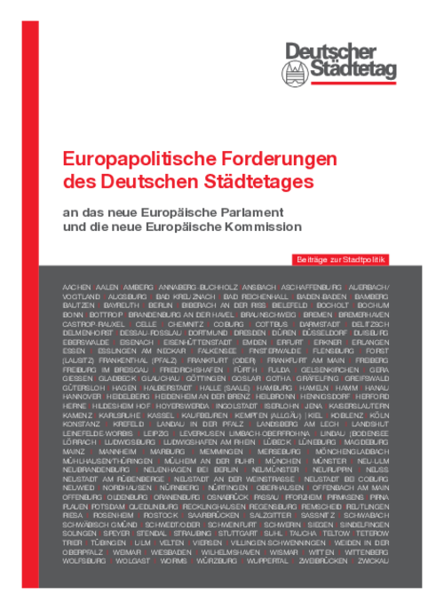 Als Deutscher Städtetag bekennen wir uns zu Europa. In sieben zentralen Themenbereichen bringen wir mit den hier vorgelegten Forderungen unsere Erwartungen gegenüber dem Europäischen Parlament und der Europäischen Kommission zum Ausdruck. Wir bekunden unsere Bereitschaft zu einer konstruktiven Mitwirkung an der Gestaltung Europas, damit Europa den Menschen (wieder) eine Perspektive bieten kann und dauerhaft erfolgreich ist.