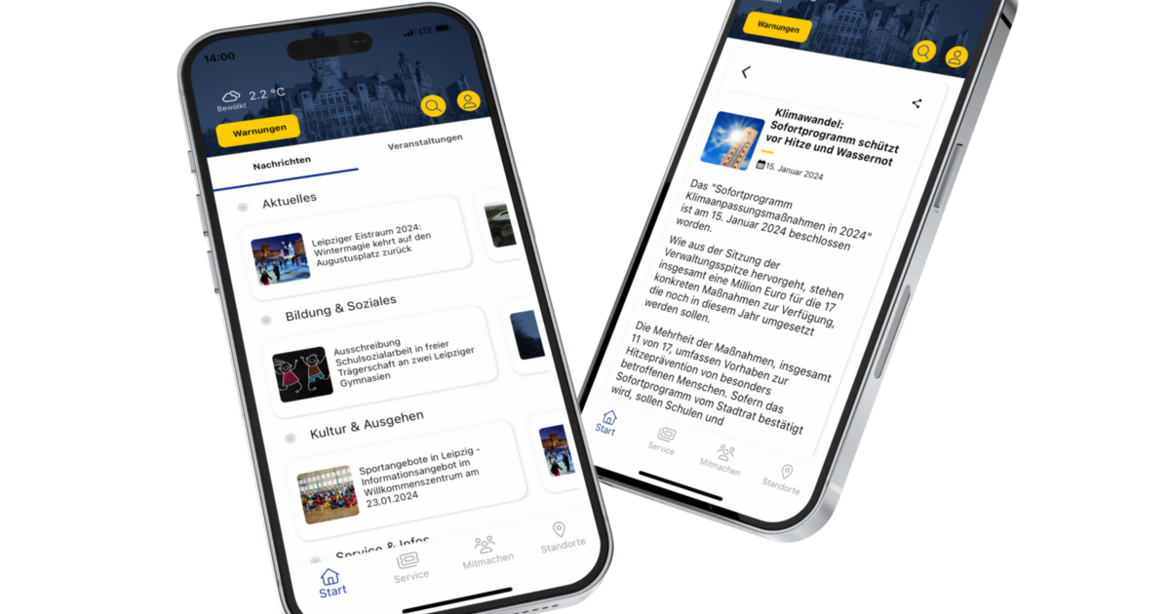 Seit dem Jahr 2024 ist unsere "Leipzig App" auf dem Markt. Initiiert vom Wirtschaftsdezernat, bietet die App schnellsten Zugang zu städtischen Informationen, bürgernahe Services und lädt zur aktiven Mitwirkung am Stadtgeschehen ein. Aktuell können u.a. Warnnachrichten empfangen, Termine im Bürgerbüro vereinbart oder Mängel im Stadtraum gemeldet werden. Der Funktionsumfang der App soll Schritt für Schritt erweitert werden.