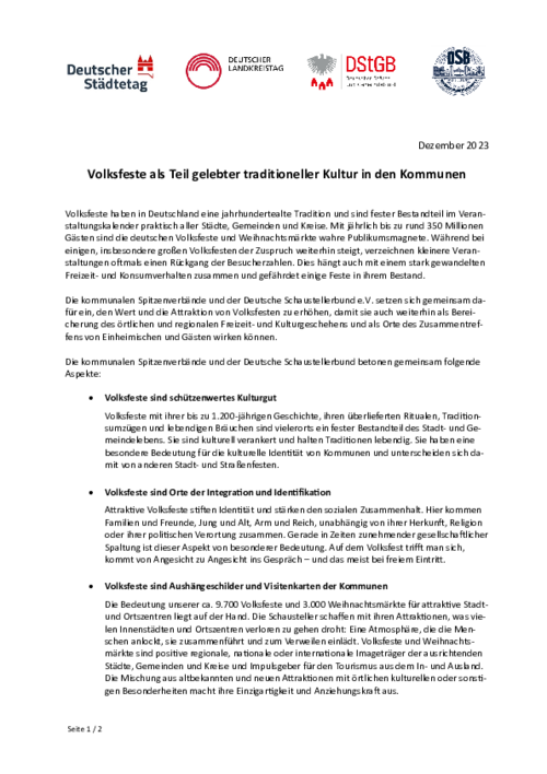 Der Deutsche Städtetag begrüßt die vorgesehenen gemeinsamen Aktivitäten zur Steigerung des Wertes und der Attraktivität von Volksfesten, um diese als Kulturgut in den Städten zu erhalten. Er unterstützt das Ziel, die Volksfeste und den Volksfesttourismus in den Städten sowie die regionale Wirtschaft zu fördern.