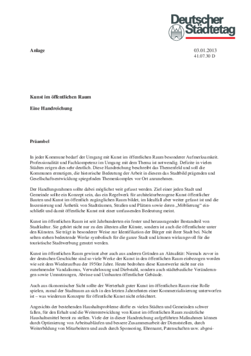 Das Präsidium des Deutschen Städtetages hat sich bereits in seiner 393. Sitzung am 13.03.2013 in Heilbronn mit Fragen des Umgangs mit Kunst im öffentlichen Raum beschäftigt und hierzu in seinem Beschluss festgestellt, dass Kunst im öffentlichen Raum einen wirksamen Beitrag zu einem positiven Erscheinungsbild sowie zum kulturellen Profil der Städte leisten soll. Ihre Platzierung sollte auf der Grundlage eines Gesamtkonzeptes erfolgen, das planerische, baukulturelle sowie ggf. historische Aspekte einbezieht und Maßnahmen der Instandhaltung, Weiterentwicklung und der Vermittlung vorsieht. Kunst im öffentlichen Raum und Stadtentwicklungskonzepte sollten in einer ressortübergreifenden Planung entwickelt werden.