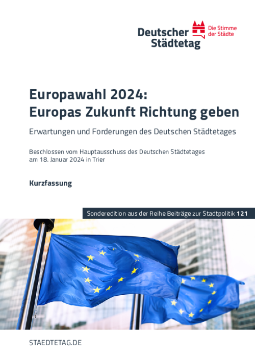 Die anstehenden Europawahlen können für die Zukunft der Europäischen Union – und damit für jede/n Einzelnen - richtungsweisend sein. Es geht um nicht weniger als die Frage, ob wir auch in Zukunft in Frieden, Freiheit, Sicherheit und Wohlstand leben können. Die deutschen Städte stehen bereit, ihren Beitrag zu leisten, um Europas Zukunft Richtung zu geben. Wir stellen an das neu gewählte Europäische Parlament und die neu besetzte Europäische Kommission elf Forderungen.