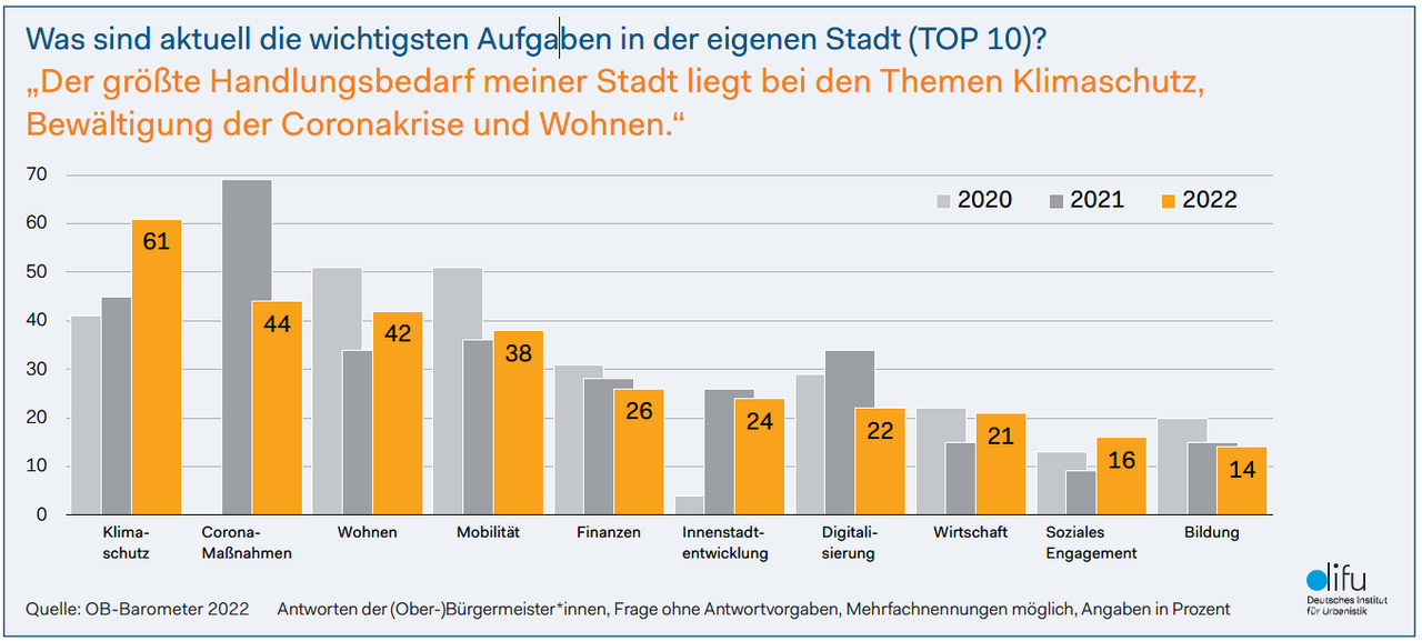 Die Jahresbefragung des Deutschen Instituts für Urbanistik (Difu) zeigt, dass im Vergleich zum Vorjahr deutlich mehr Oberbürgermeisterinnen und Oberbürgermeister Klima als wichtigstes aktuelles Handlungsfeld der Kommunen bewerten.