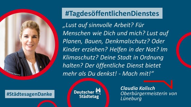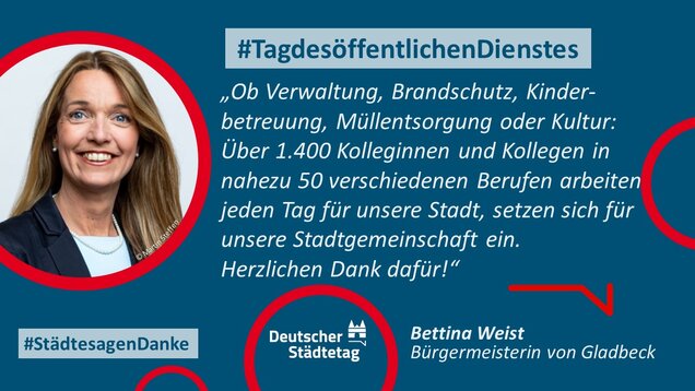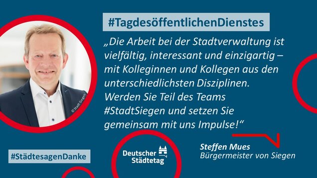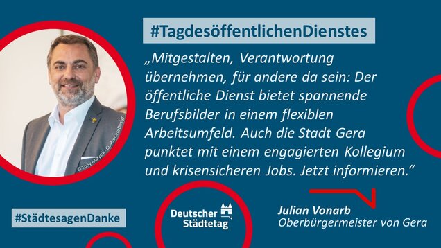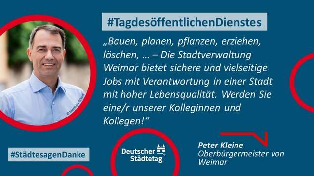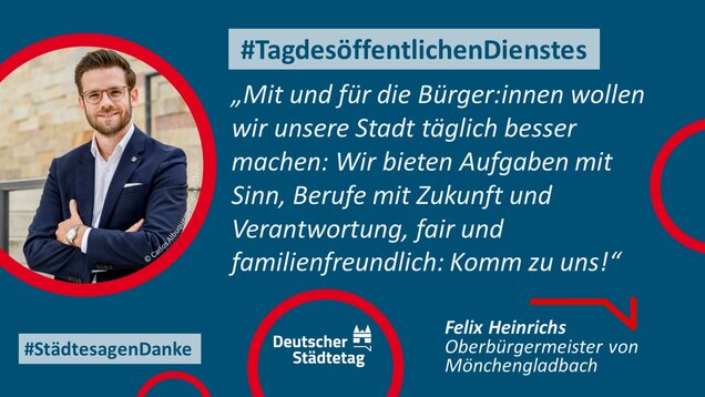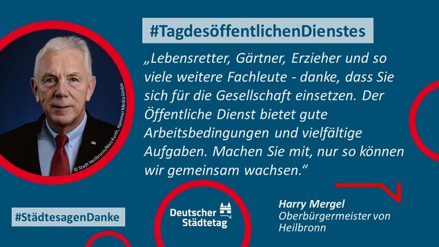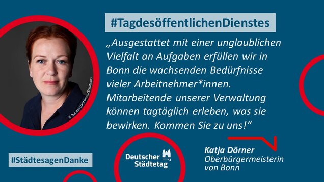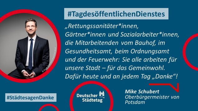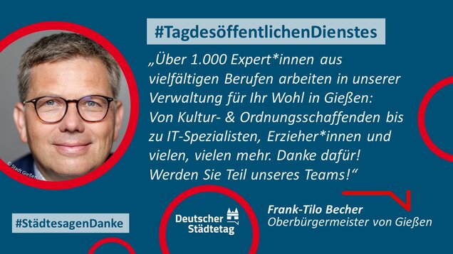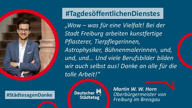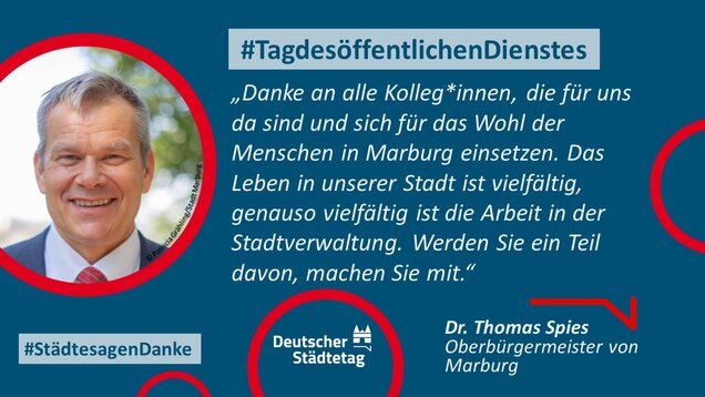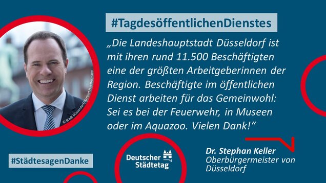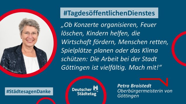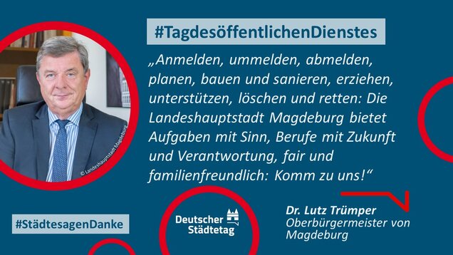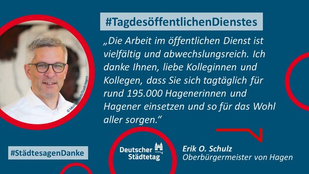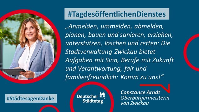 "Anmelden, ummelden, abmelden, planen, bauen und sanieren, erziehen, unterstützen, finanzieren, pflanzen, löschen und retten. Die Tätigkeiten im öffentlichen Dienst sind so vielfältig wie das Leben. Ich danke allen Kolleginnen und Kollegen, die sich in den Stadtverwaltungen für die Gemeinschaft einsetzen."