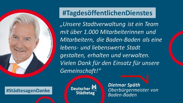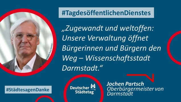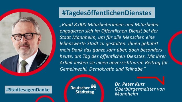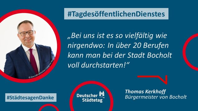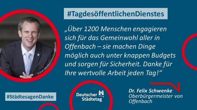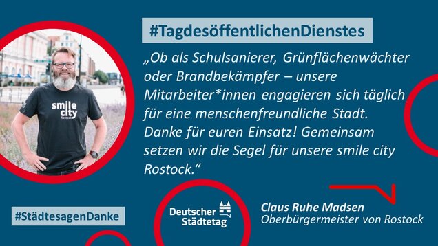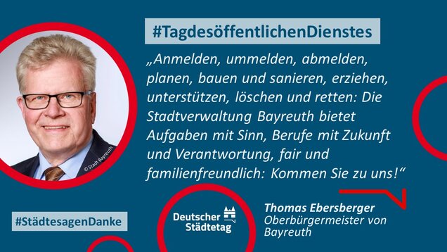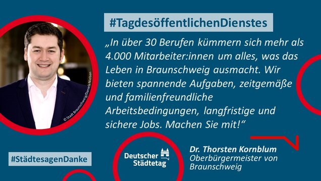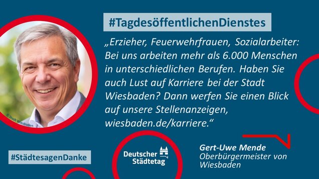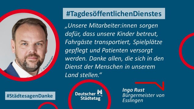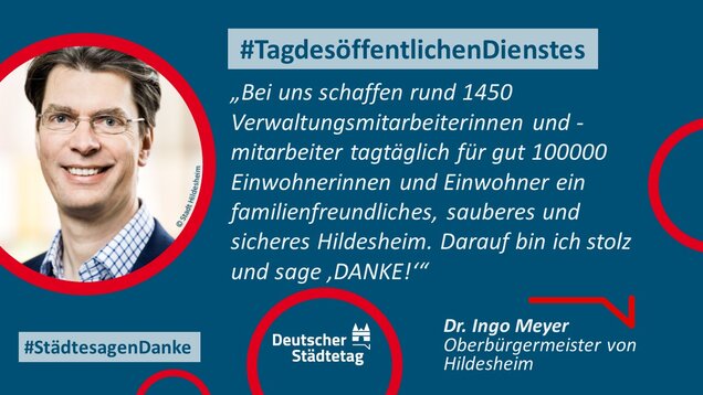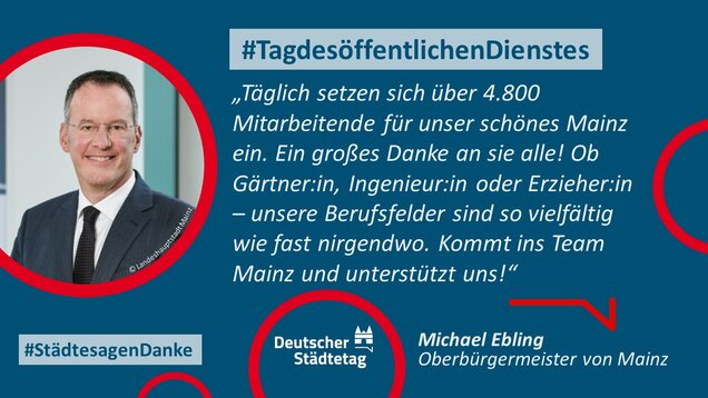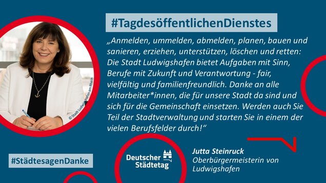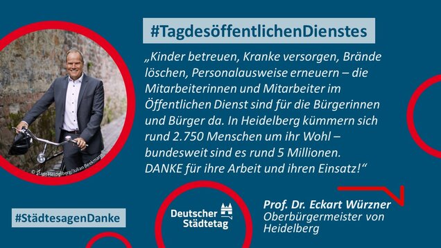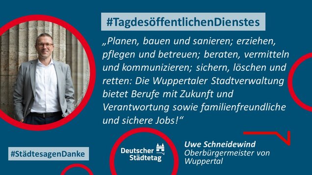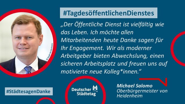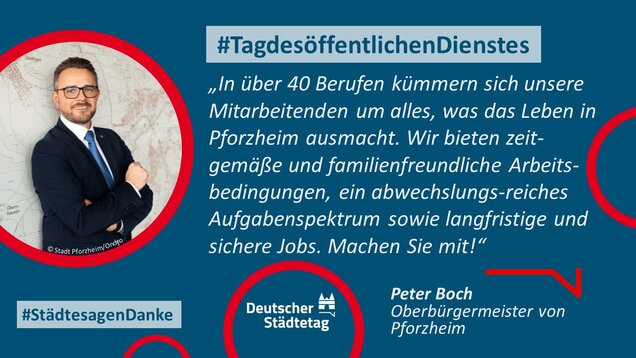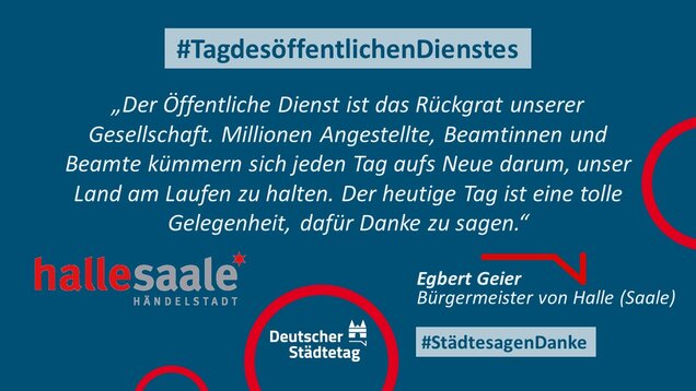 "Anmelden, ummelden, abmelden, planen, bauen und sanieren, erziehen, unterstützen, finanzieren, pflanzen, löschen und retten. Die Tätigkeiten im öffentlichen Dienst sind so vielfältig wie das Leben. Ich danke allen Kolleginnen und Kollegen, die sich in den Stadtverwaltungen für die Gemeinschaft einsetzen."