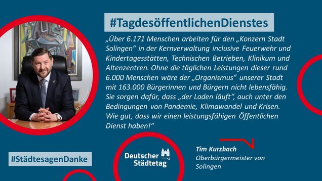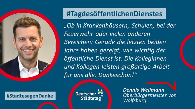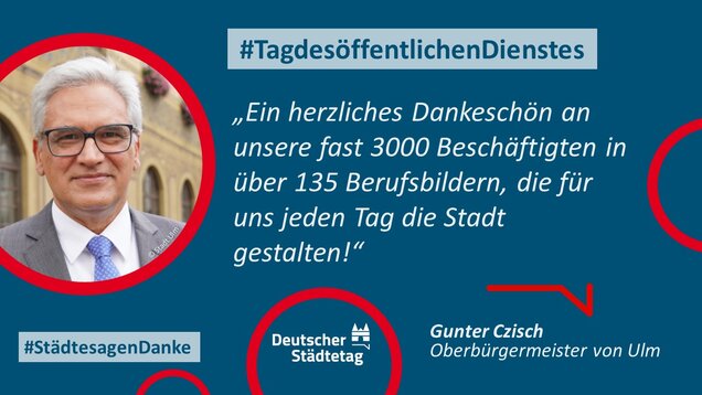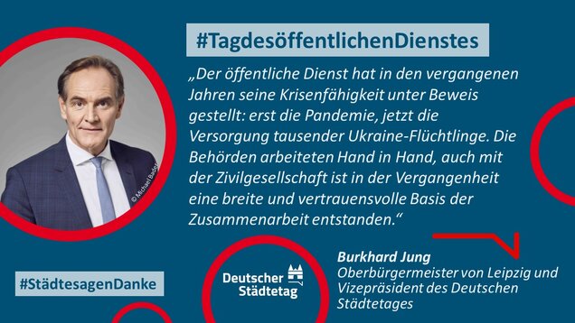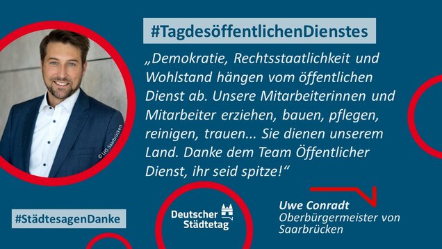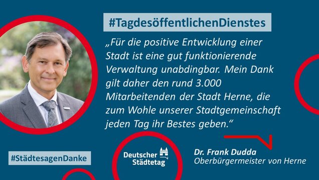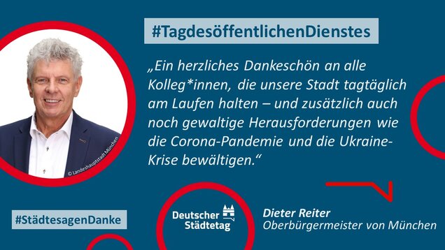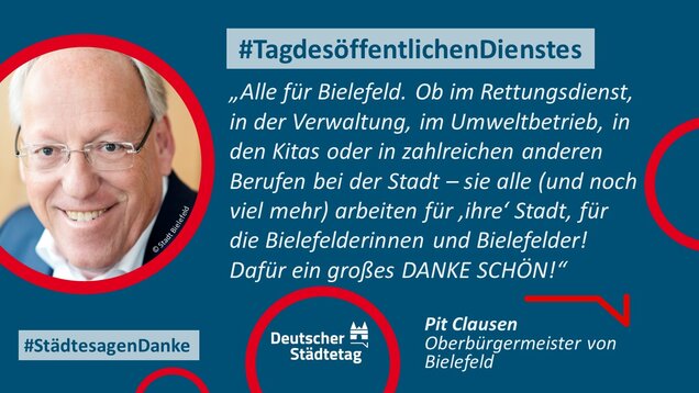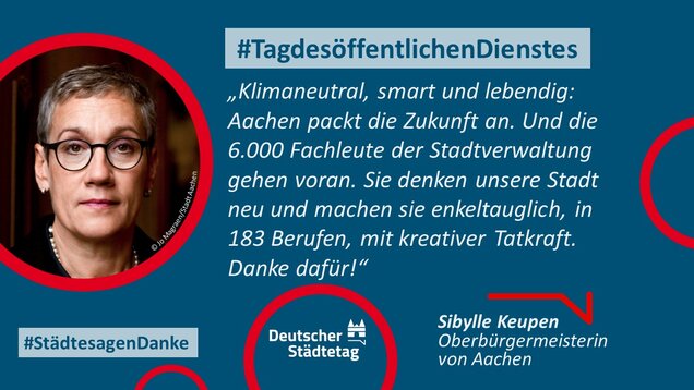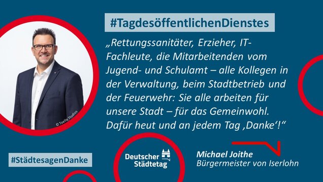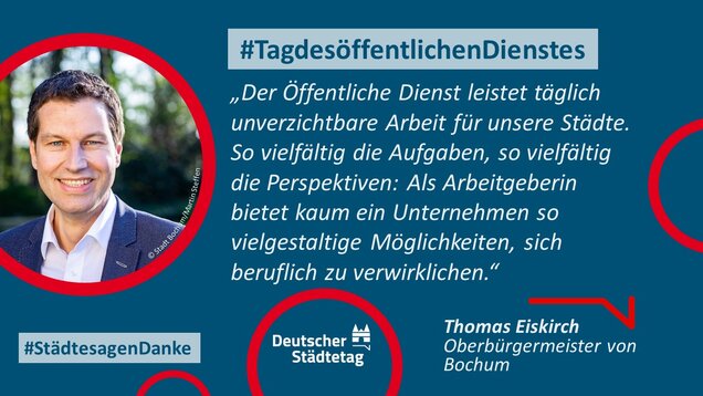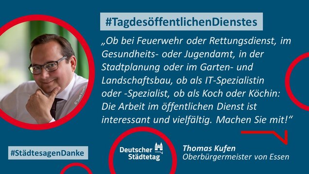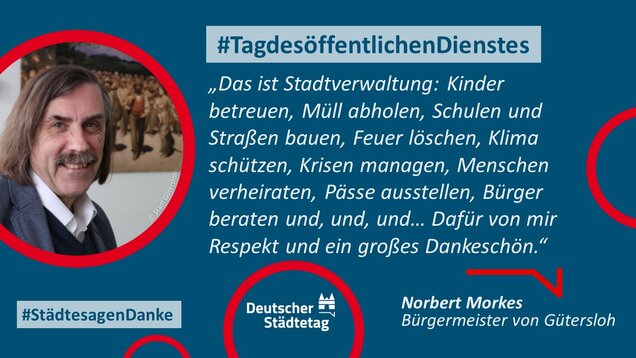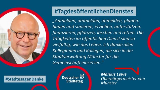 Zum 18. Internationalen Tag des öffentlichen Dienstes am 23. Juni 2022 sagen die Städte in einer gemeinsame Twitter-Aktion "Danke". Im "Twittergewitter" unter dem Hashtag #TagdesöffentlichenDienstes werben die Städte für die vielfältige Arbeit in den Städten - im Dienste des Gemeinwohls. Den Anfang macht der Präsident des Deutschen Städtetages und Oberbürgermeister der Stadt Münster, Markus Lewe: