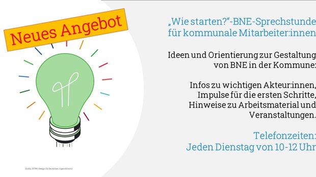 Damit sich Beschäftige von Kommunen das Konzept leichter erschließen und den Einstieg in die Gestaltung von BNE in der Kommune schneller finden, bietet das BNE-Kompetenzzentrum eine Sprechstunde an. Das Kompetenzzentrum ist ein vom Bundesministerium für Bildung und Forschung gefördertes Verbundprojekt, das Kommunen bundesweit bei der systematischen Weiterentwicklung und Implementierung von BNE auf lokaler Ebene begleitet.