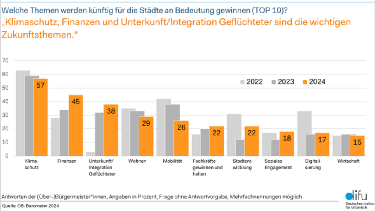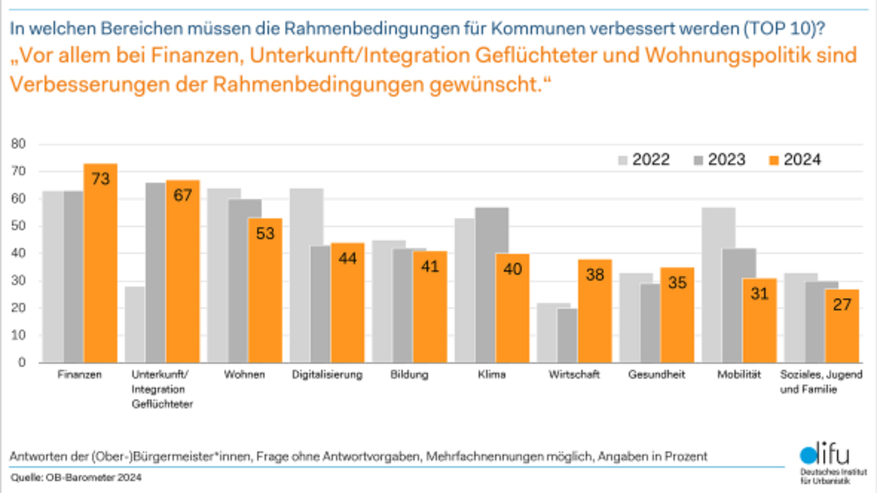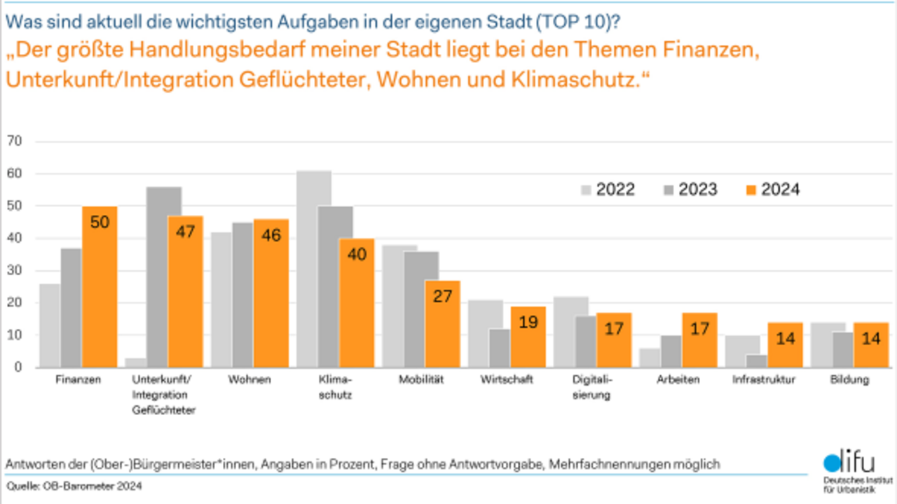 Auch 2024 müssen die Kommunen mit verschiedenen Krisenfolgen gleichzeitig umgehen. Denn die Rahmenbedingungen haben sich auf der kommunalen Ebene nicht grundlegend verändert. Laut OB-Barometer des Difu nennen die Stadtspitzen im Jahr 2024 – erstmals seit 2015, dem Beginn der jährlichen Difu-Befragung – das Thema "Finanzen" als aktuell wichtigstes Handlungsfeld für die eigene Stadt. Auf den weiteren Plätzen folgen die Themen "Unterbringung und Integration von Geflüchteten", "Wohnungsbau und Schaffung von bezahlbarem Wohnraum" sowie die "Klimathematik", die die (Ober)Bürgermeister/innen (OBs) zugleich mit Aufgaben wie Energiepolitik und Wärmewende verknüpfen.