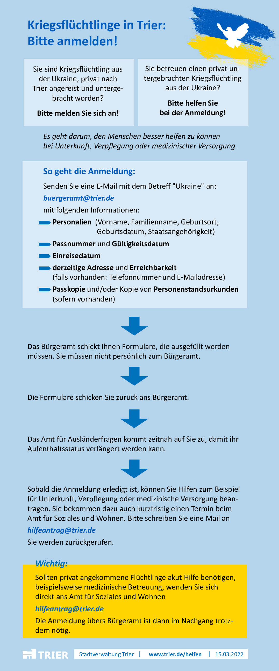 - Die Stadtverwaltung hat eine telefonische Informationsstelle für Fragestellungen von Flüchtlingen aus der Ukraine eingerichtet. Die Telefonnummer 0651/718-2520 ist montags bis freitags von 9:00 Uhr bis 14:00 Uhr besetzt. Es handelt sich auch explizit um keine Hotline, da das dort eingesetzte Personal höchst qualifiziert ist (eine Volljuristin, eine Jura Studentin) um mit den diffizilen Fragestellungen auf geeignete Art und Weise umzugehen.