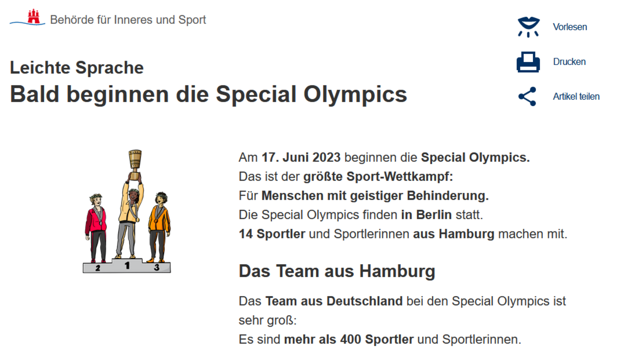 Die Pressestelle des Senats gewährleistet somit mehr Teilhabe durch ein umfangreicheres Angebot an Inhalten in Leichter Sprache. Daneben bietet das Stadtportal hamburg.de zahlreiche Texte in Leichter Sprache, die von Übersetzungsbüros unter Einbezug von Prüfgruppen zur Überprüfung der Verständlichkeit übersetzt werden.